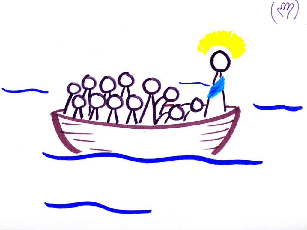 Jesus walks on the water to the boat of the apostles and Peter tries to walk out to meet Jesus but sinks in the water.
